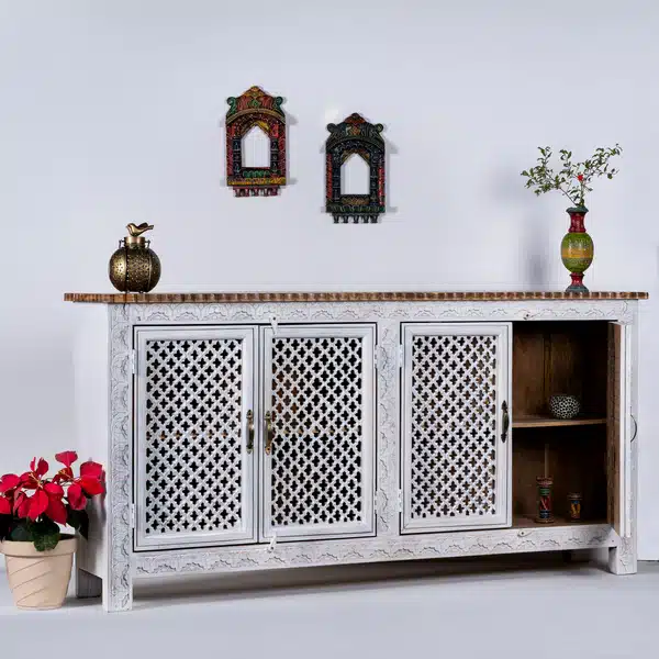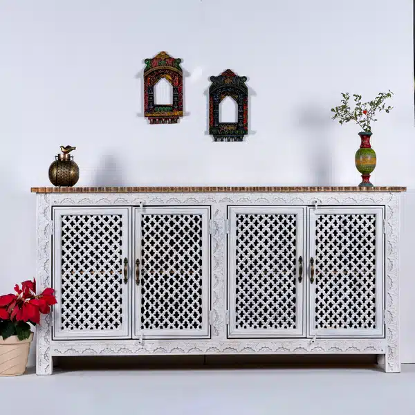 Hand Carved White Jaali 4 Door Sideboard