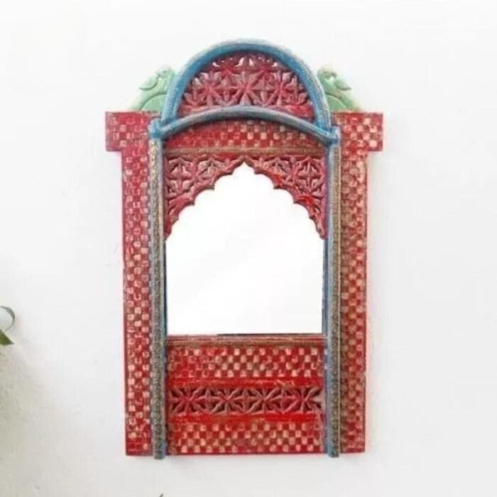 Hand Carved Red Mehrab Jharokha Mirror Frame