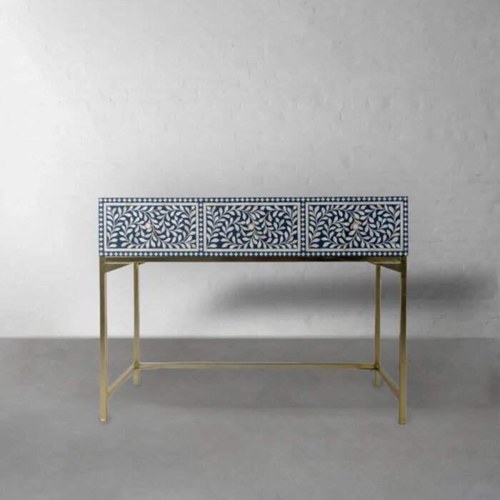 Bone Inlay Blue Floral Console Table With Three Drawers