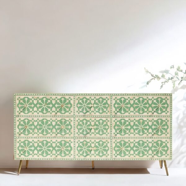 Original price was: $3,365.00.$3,025.00Current price is: $3,025.00.Bone Inlay 9 Drawer Floral Dresser In Green
