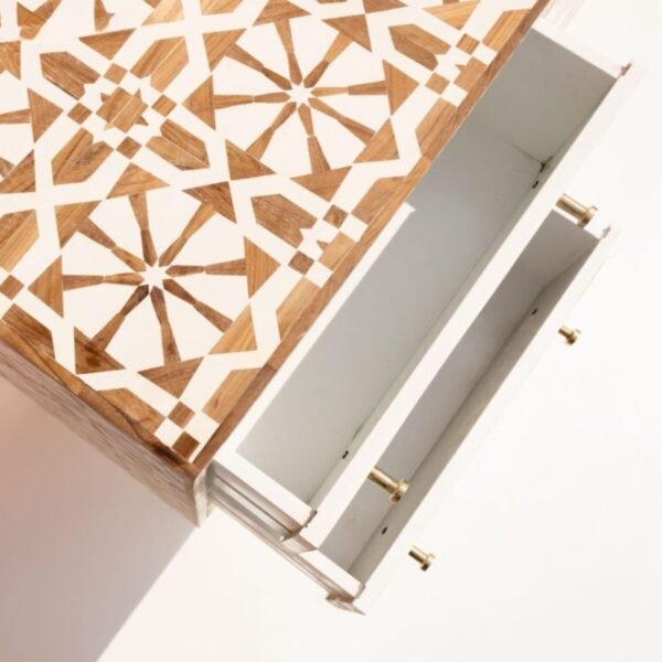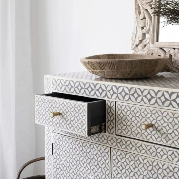 Bone inlay furniture is crafted using small pieces of ethically sourced bone, intricately inlaid into solid wood surfaces to create decorative patterns.