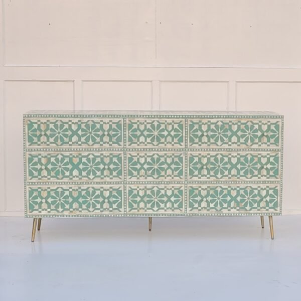 Our bone inlay sideboards are not just furniture but pieces of art that tell a story of heritage, skill, and dedication. Made from hand-carved solid wood, these sideboards feature detailed floral and geometric patterns, inlaid meticulously by skilled artisans. The process of crafting a single bone inlay piece requires precision and patience, ensuring that every sideboard is unique and visually striking.