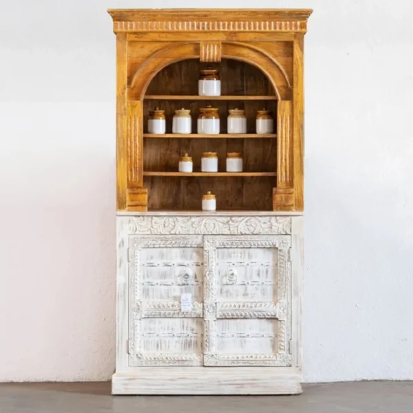 For those seeking a blend of traditional and modern aesthetics, our dual-tone crockery units offer the perfect solution. The Hand Carved Dual Tone Indian Style Display and Crockery Unit combines rich wood tones with contrasting finishes, creating a visually striking piece. The intricate hand-carved patterns add depth and texture, making it a standout addition to any dining space.