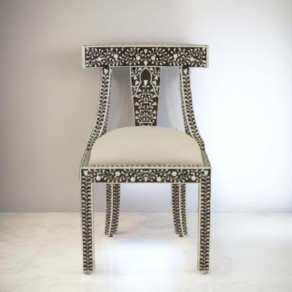 Bone Inlay Black Floral Seating Chair: This chair showcases the meticulous art of bone inlay, featuring intricate floral patterns set against a black backdrop. It's a statement piece that adds a touch of sophistication to any dining space.