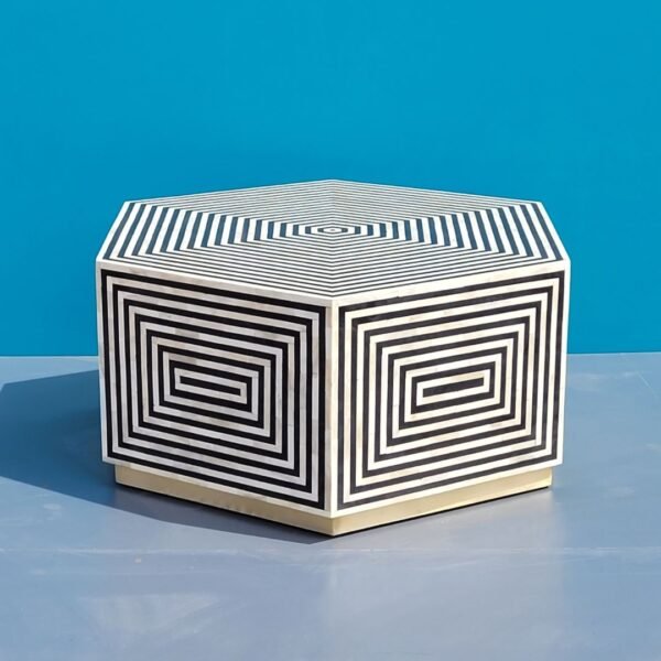 For those seeking a distinctive touch, hexagonal tables present an eye-catching alternative. Their geometric design adds a contemporary flair to traditional craftsmanship. Our Bone Inlay Black Abstract Pattern Hexagon Coffee Table is a testament to this unique style.