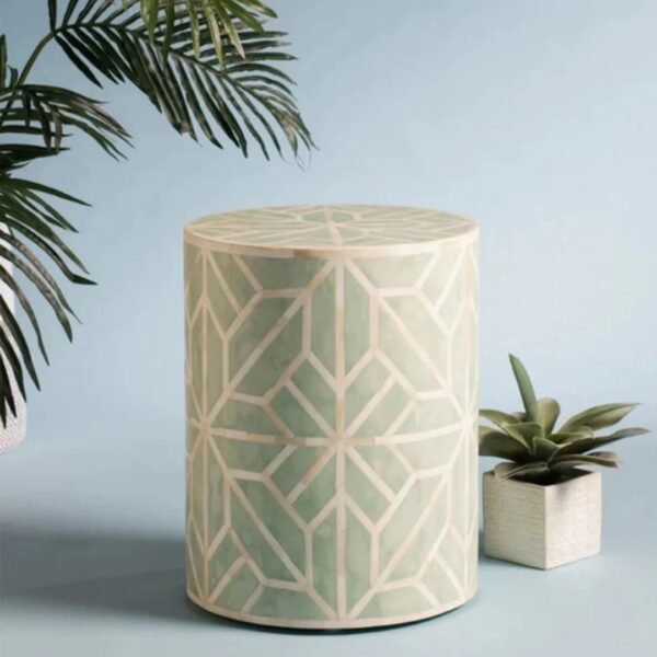 Bone Inlay Sea Green Drum Style End Table: With its drum-style design and soothing sea green hue, this table adds a touch of serenity and sophistication to your decor.