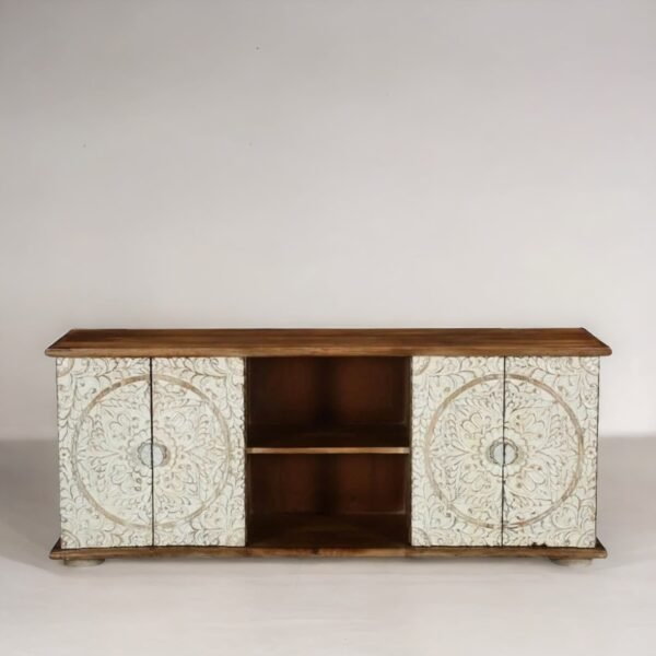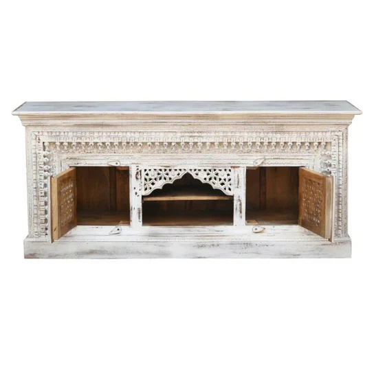 Hand Carved Natural Solid Wood T.V. Console Unit: This unit showcases intricate hand-carved details on natural solid wood, offering a rustic yet refined look. The spacious design ensures ample storage for your media essentials.