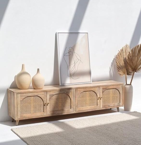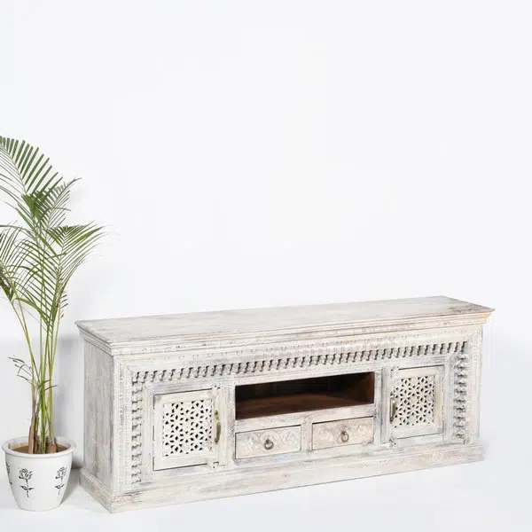 Style and Aesthetics: Ensure the design of the T.V. unit complements your existing décor. Our collection ranges from rustic reclaimed wood designs to vibrant hand-painted pieces, allowing you to choose one that aligns with your style preferences.