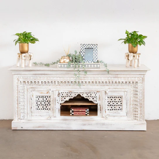 Original price was: $2,436.00.$2,193.00Current price is: $2,193.00.Hand Carved Distressed White TV Console Unit