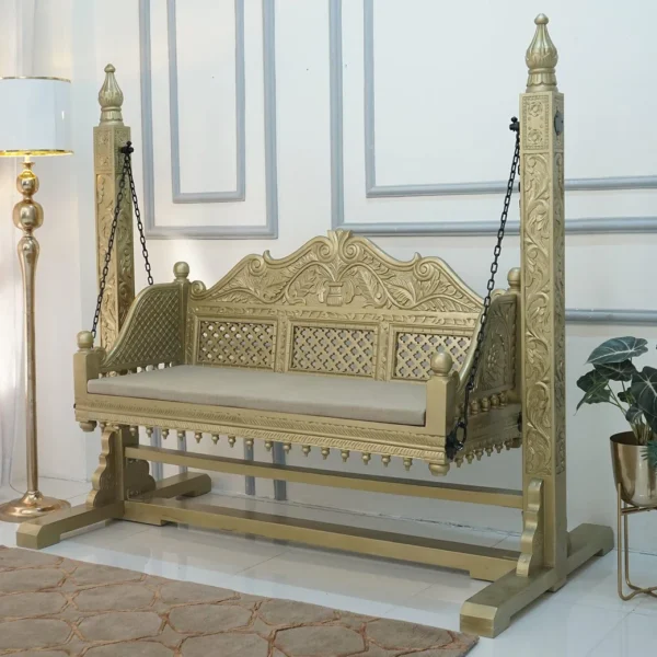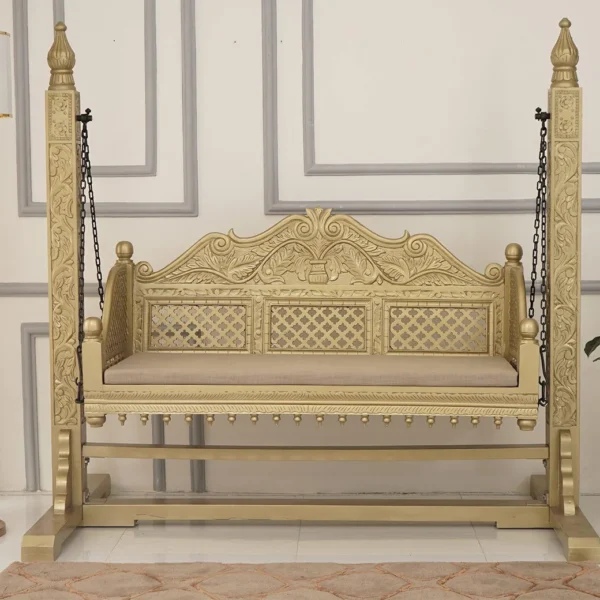 Original price was: $7,222.00.$6,500.00Current price is: $6,500.00.Hand Carved Gold Finish Wooden Swing Chair