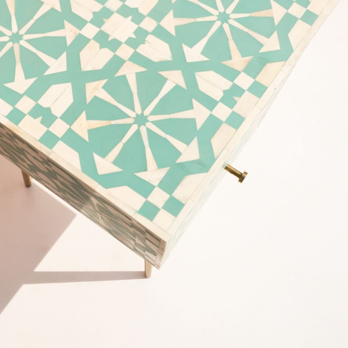 Originally, bone shards were arranged in simple, organic mosaic patterns. Over time, this technique evolved to encompass elaborate designs featuring geometric, floral, fishtail,and herringbone arrangements. The gaps around the bone are filled with colored resin, resulting in a flawless surface.