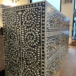Bone inlay involves the meticulous craftsmanship of intricately carving bone pieces into small forms, which are then delicately inserted into the surfaces of various objects like furniture and homewares.