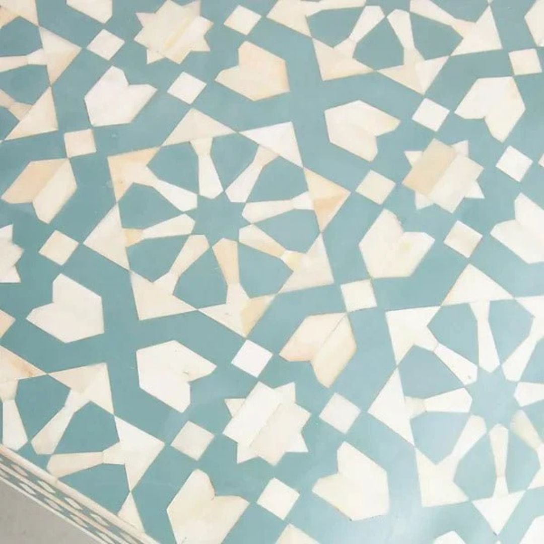 Originally, bone shards were arranged in simple, organic mosaic patterns. Over time, this technique evolved to encompass elaborate designs featuring geometric, floral, fish tail and herringbone arrangements. The gaps around the bone are filled with colored resin, resulting in a flawless surface.