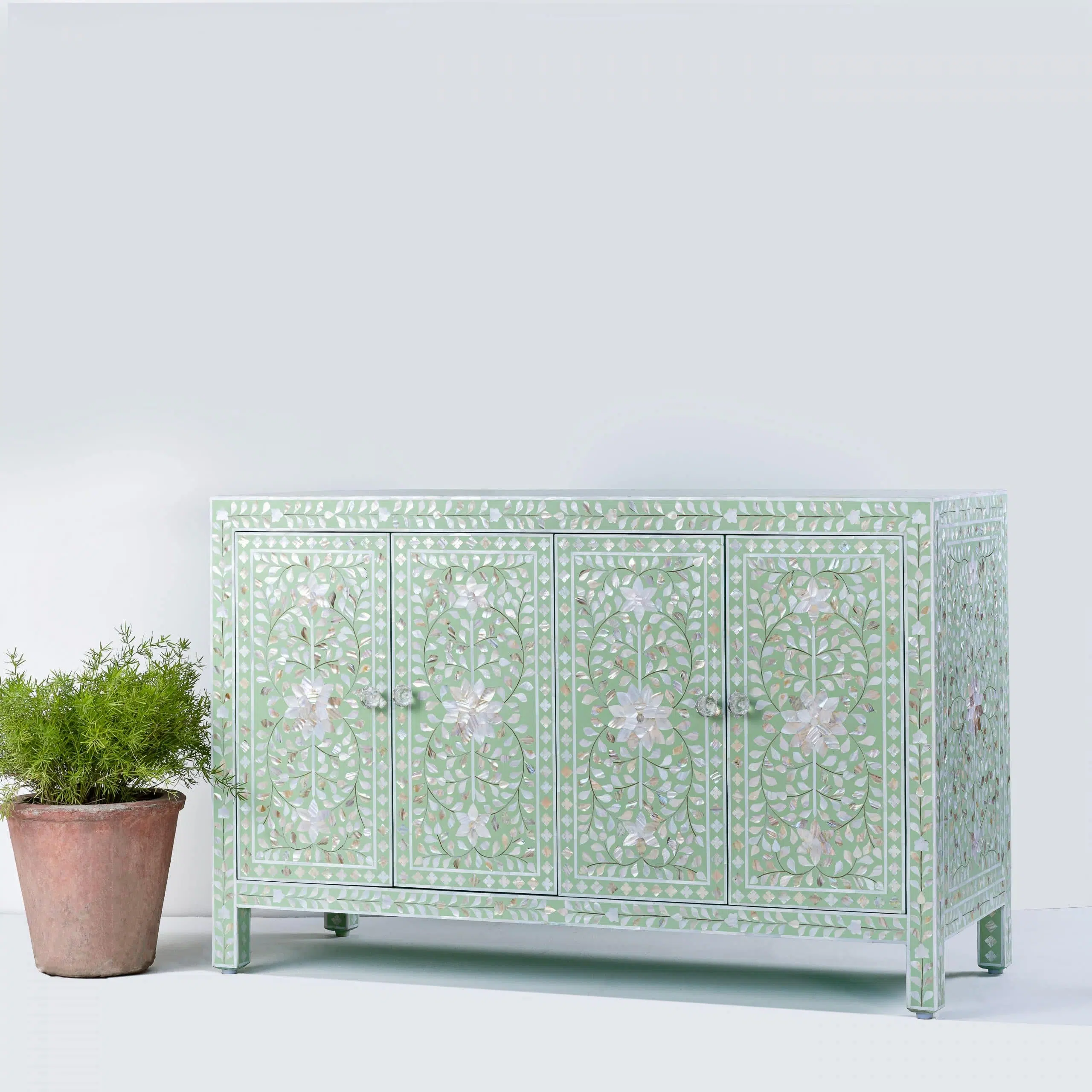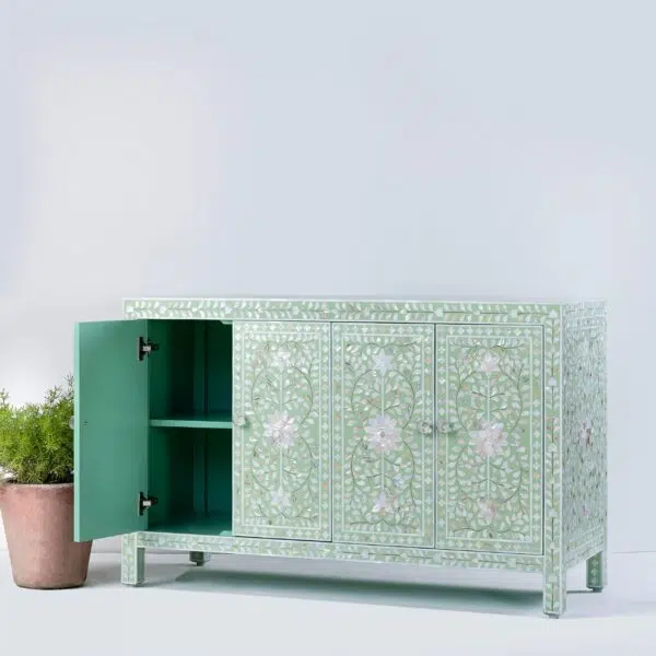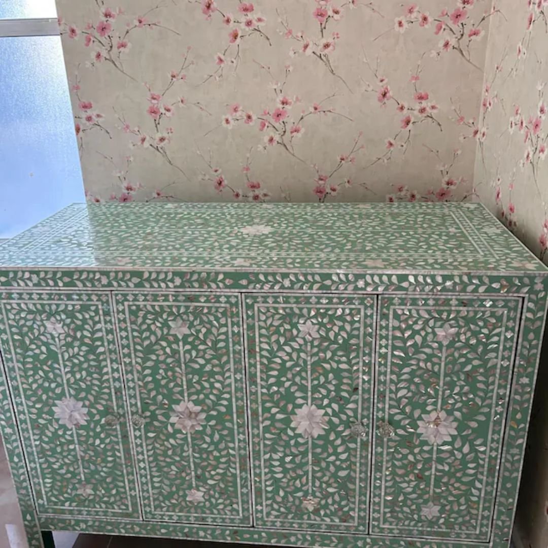 Bone inlay involves the meticulous craftsmanship of intricately carving bone pieces into small forms, which are then delicately inserted into the surfaces of various objects like furniture and homewares.