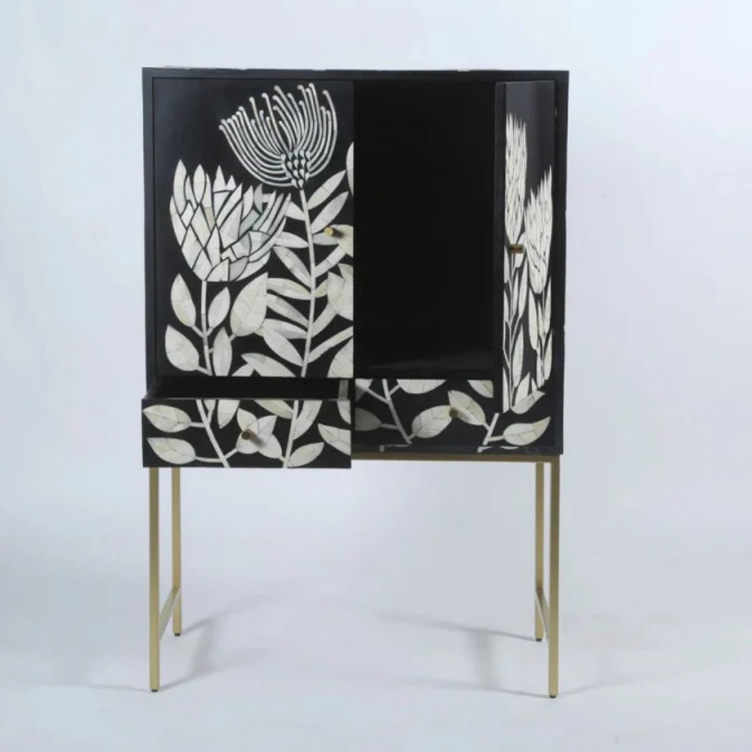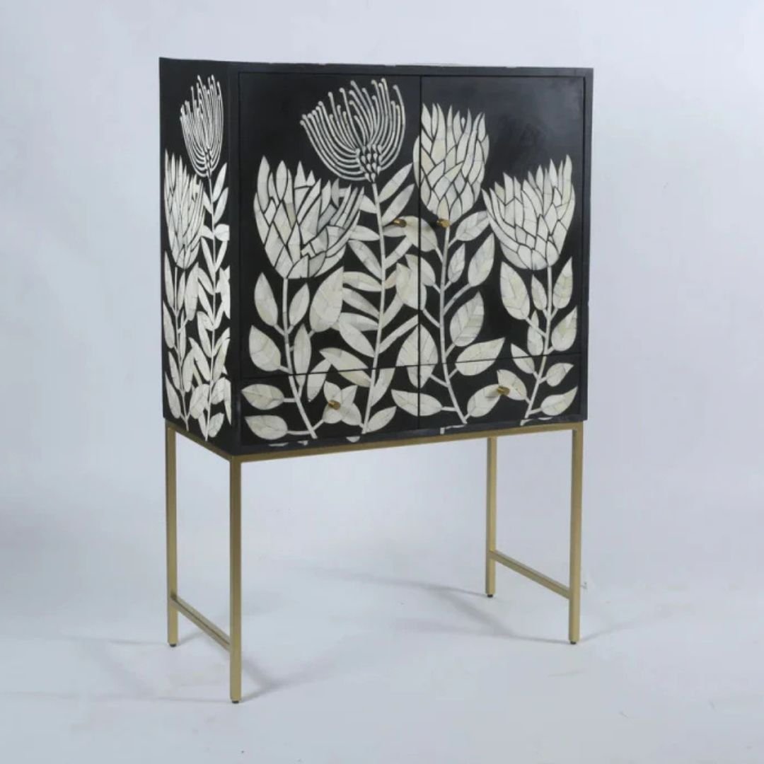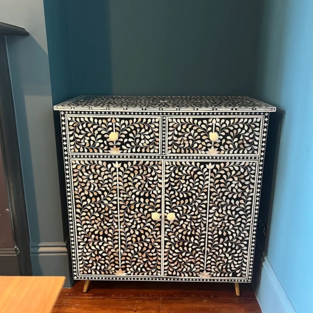 - Technique: Bone inlay—intricate carving of bone pieces, inserted into furniture and homeware surfaces.